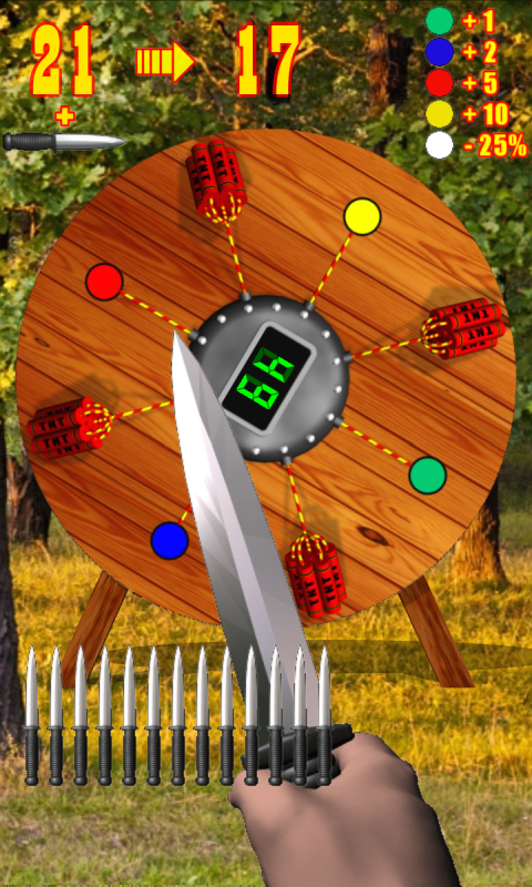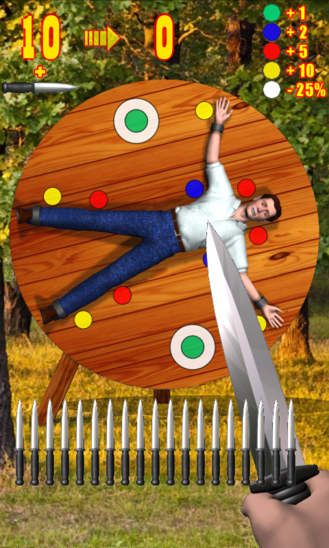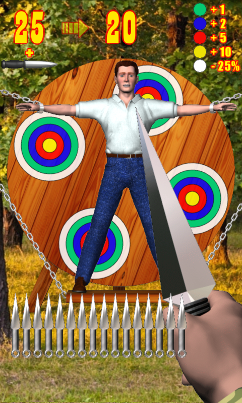 Touch the screen. Move your finger so that the tip of the blade moved to the location where you want to throw a knife. Remove your finger from the screen. Knife thrown.